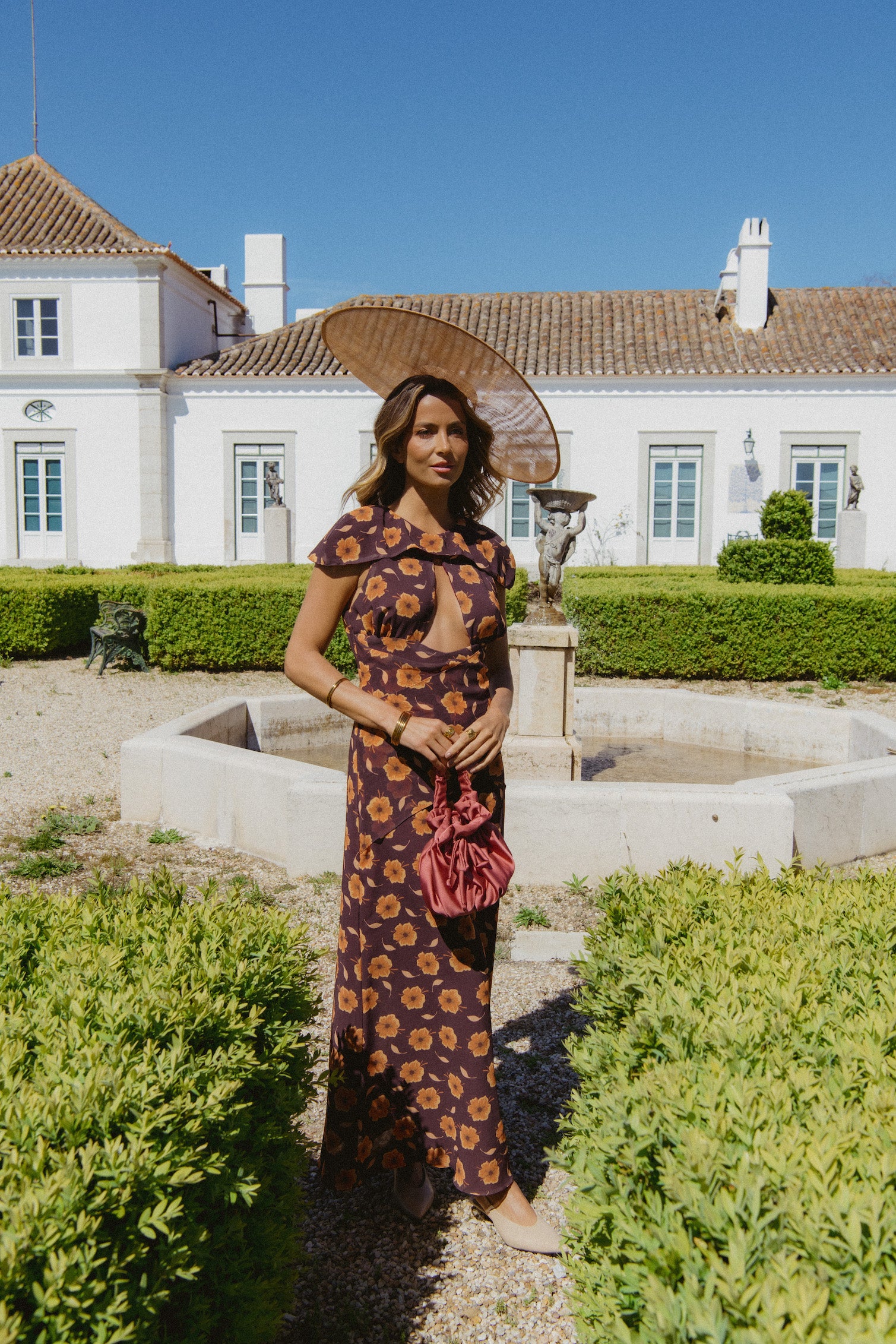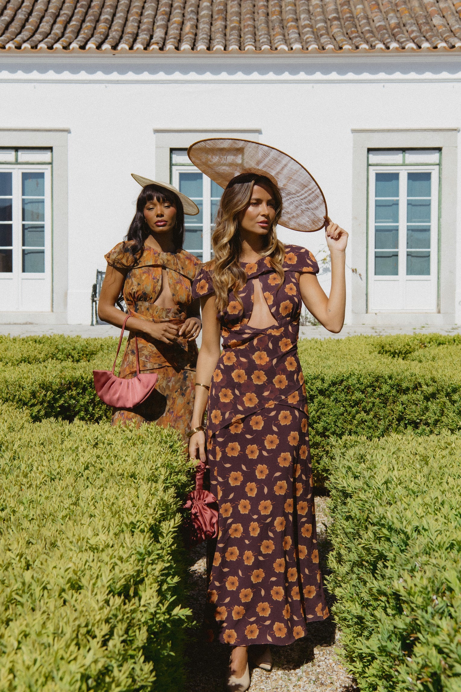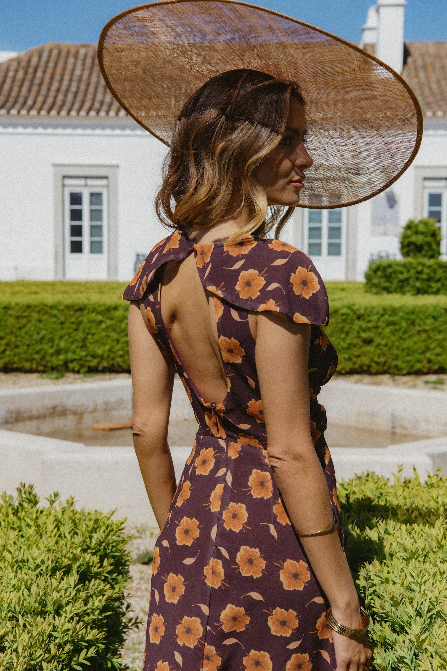 Long dress in lightweight fabric with floral print. Structured neckline with an overlay detail and subtle front cut-out. Defined waist with soft draping. Flowing A-line skirt. Open back with invisible zipper.