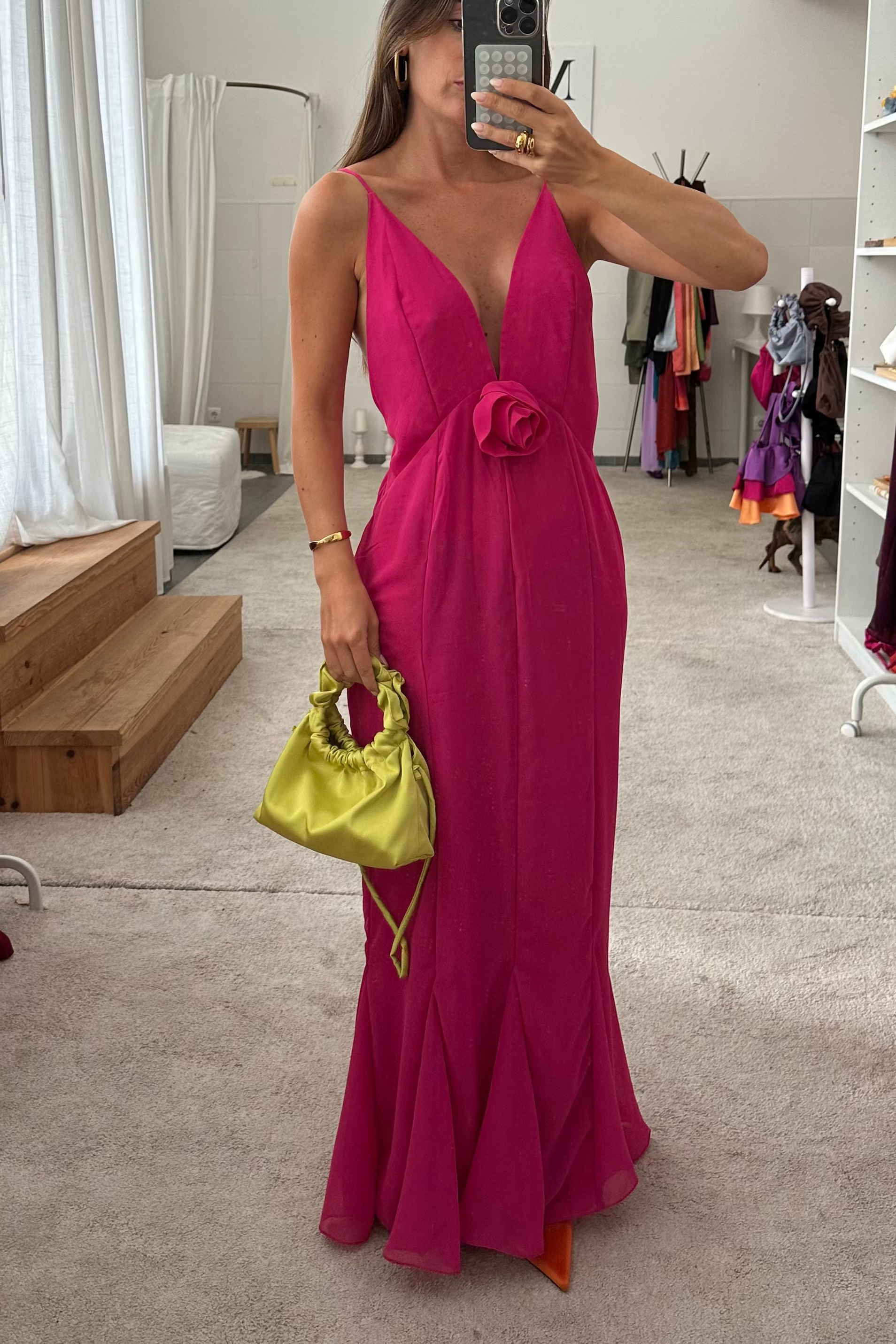 Long dress made in chiffon fabric. V-neckline and thin adjustable straps. Detail of flower. Concealed zip in the seam. THE SCARF IS SOLD SEPARATELY!