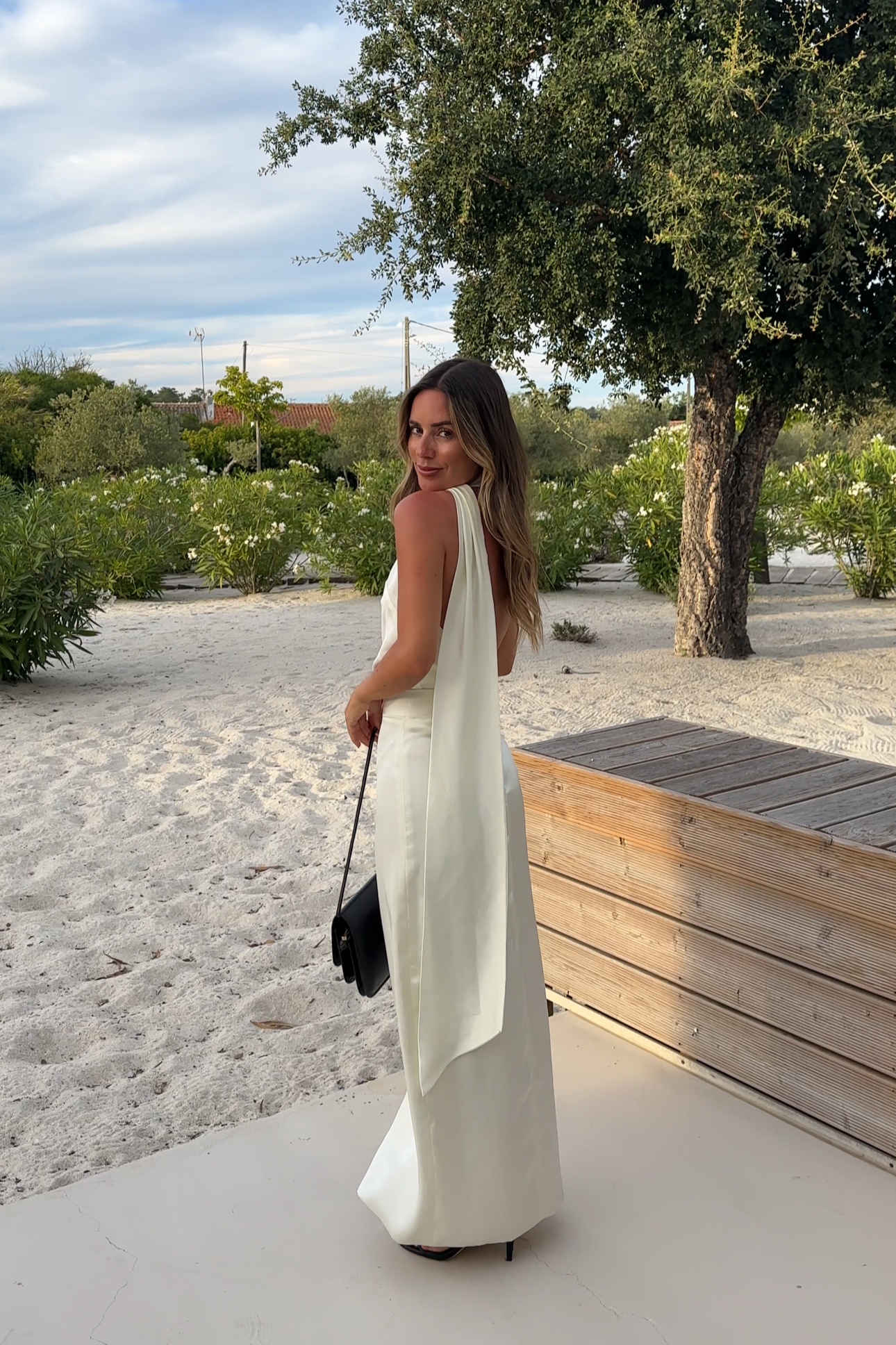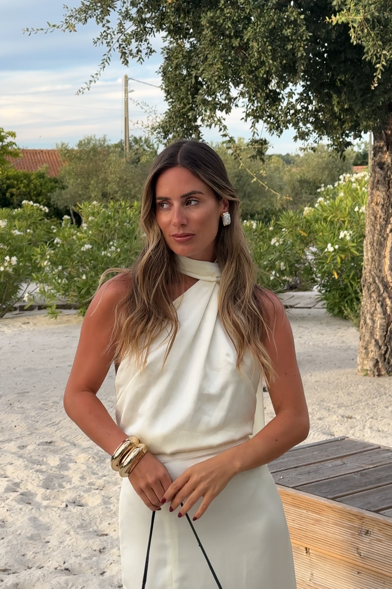 Top with open back with tape dropped at the back, there is a button at the neck.