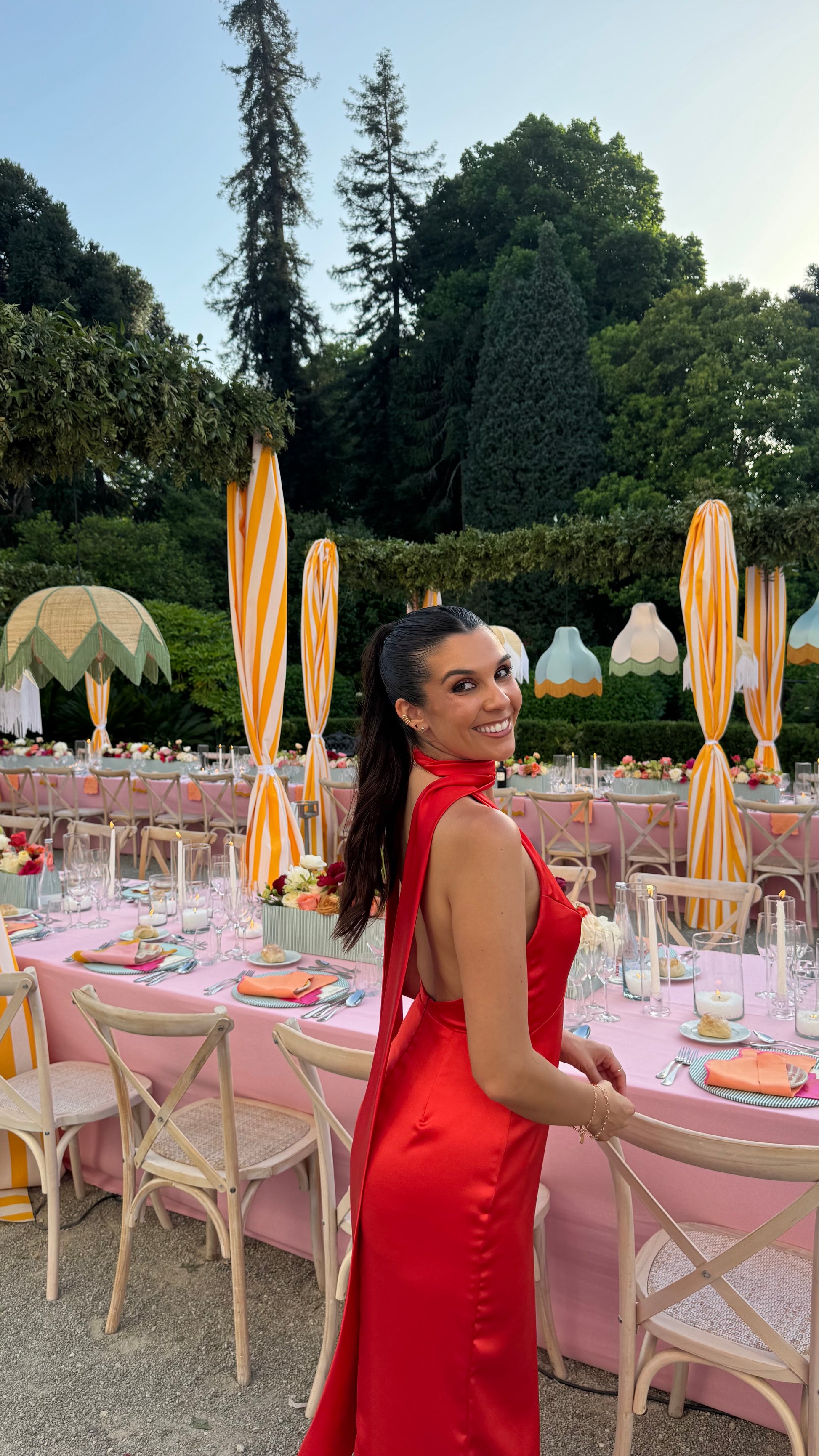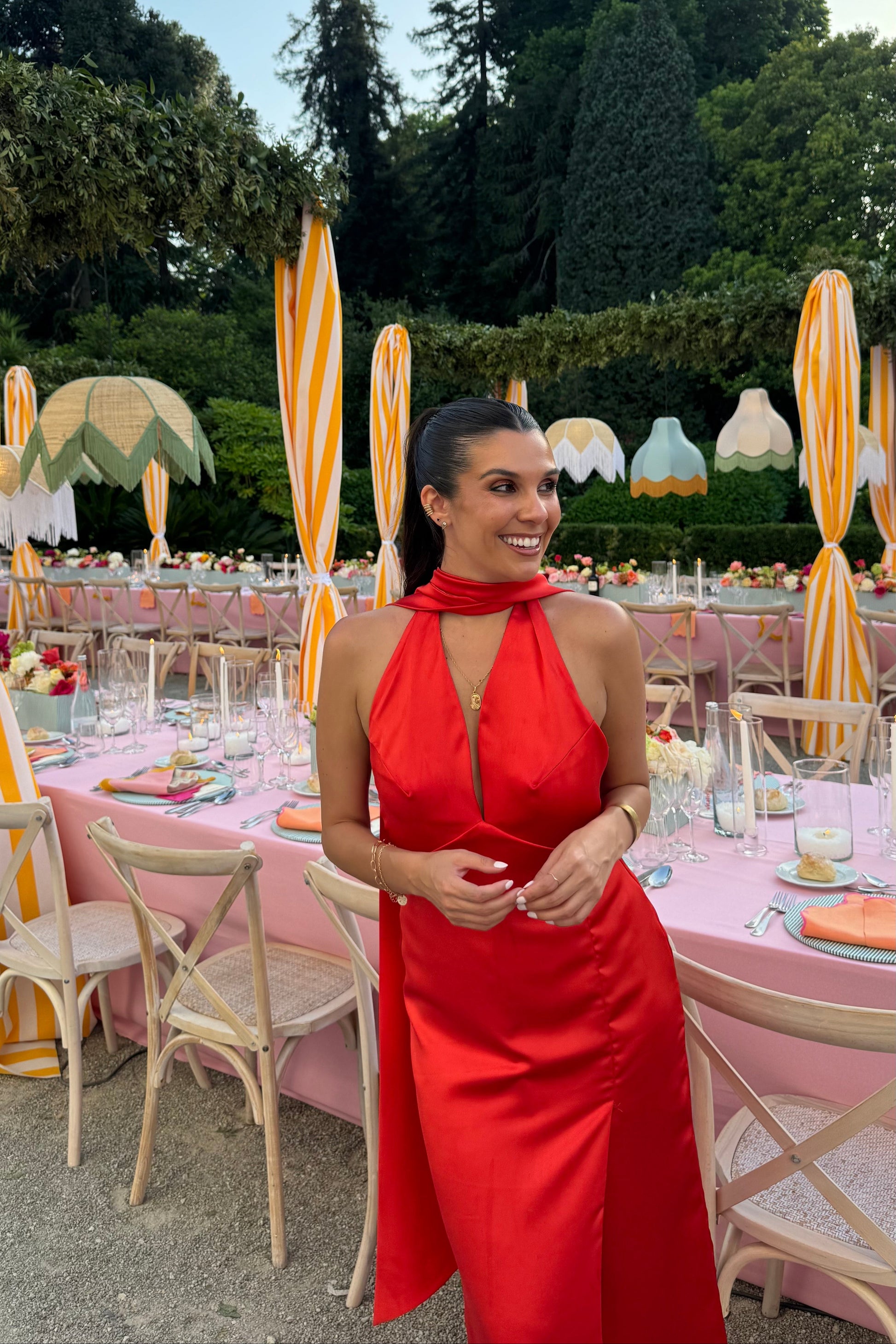 At the bottom, the skirt is long, belted with a clasp and a sharp slit on the right side.